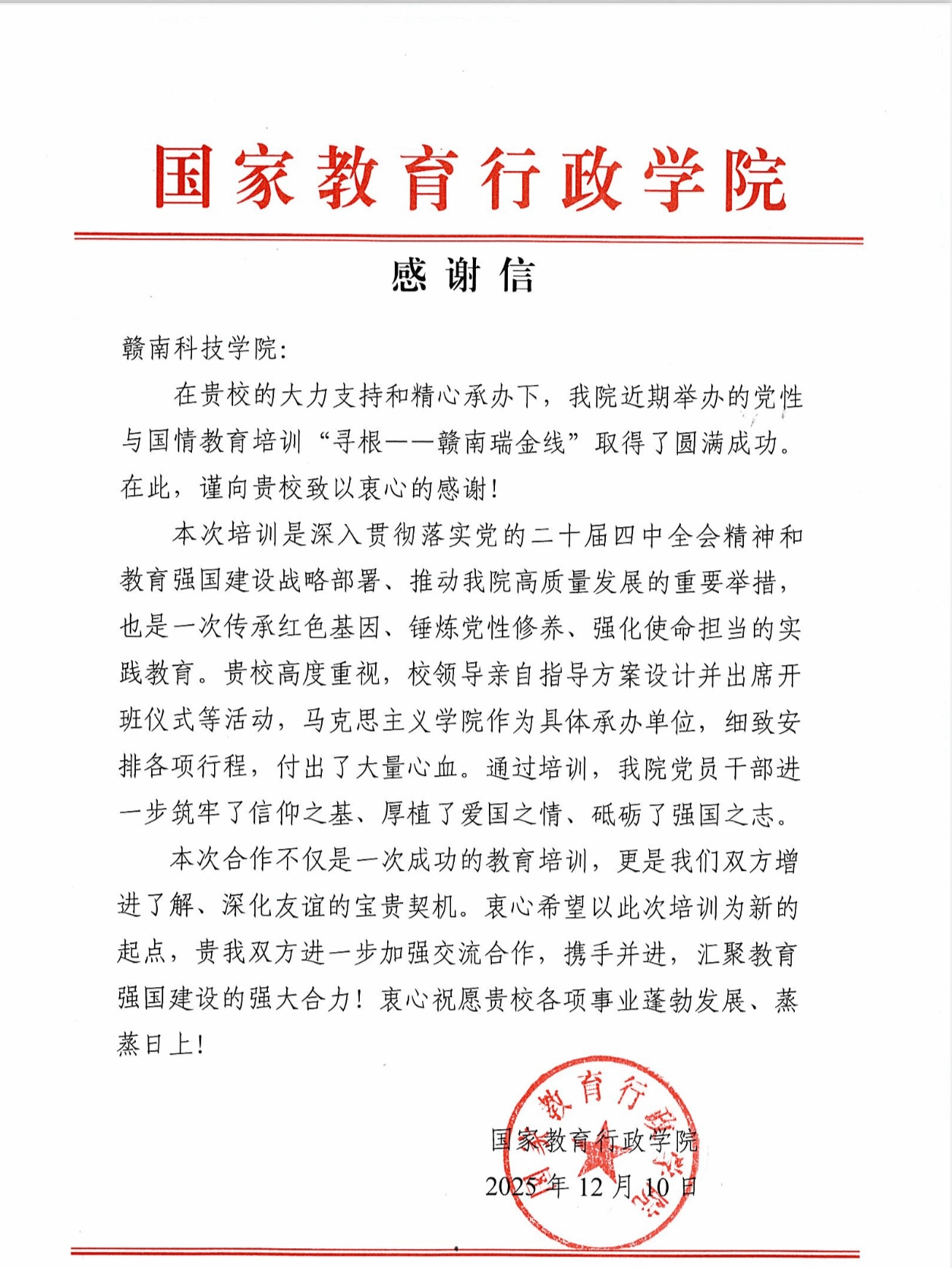 本网讯:近日,国家教育行政学院专门向我校发来感谢信,对我校精心组织承办的“寻根——赣南瑞金线”党性与国情教育培训活动给予高度认可和诚挚感谢。信中充分肯定我校在培训组织、课程设计和服务保障等方面的细致工作,并对今后进一步深化合作、共助教育强国建设提出美好愿景。