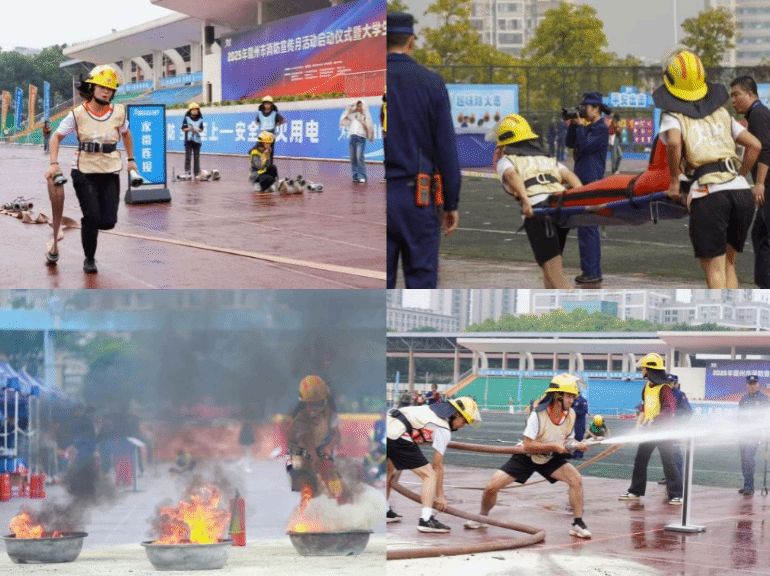 运动会赛场上我校学生代表队与江西理工大学、赣南师范大学等九所高校的学生代表队同台竞技,在“穿越火线”“远程供水”“正中靶心”“接力穿戴”等4个团体项目,以及“水带连接”“火线逃生”等2个单人项目中展开了激烈角逐。