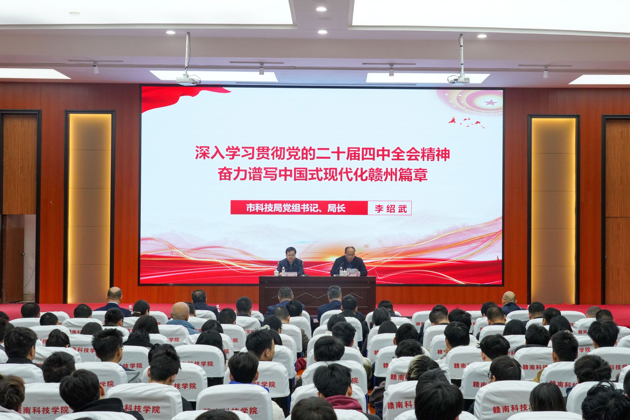 宣讲中,李绍武围绕充分认识“十四五”时期取得的重大成就,准确认清“十五五”时期在基本实现社会主义现代化进程中的重要地位和国内外形势判断,切实把握“十五五”时期经济社会发展的指导思想、重大原则和主要目标,全面理解“十五五”时期经济社会发展的战略任务和重大举措,深刻领会“十五五”时期经济社会发展的根本保证,着力推动党的二十届四中全会精神落地见效等方面,对全会精神作深入解读和系统阐释。针对“十五五”时期的战略任务,李绍武重点聚焦产业发展与科技创新两大核心领域,强调产业发展要坚持“固本升级、创新育新、扩容提质、强基增效”,赣州需依托稀土等特色资源,抢占新能源、新材料等战略性新兴产业风口;科技创新要紧扣“原创攻关、融合创新、一体改革、数字赋能”,破解“卡脖子”技术难题,推动产学研深度融合。他充分肯定学校转设为本科院校以来,办学质量与整体实力全面跃升,以及与华为、格力等企业共建产业学院取得显著成效,鼓励学校继续发挥人才培养与科研创新优势,紧密对接区域产业发展需求,在服务国家战略、助力革命老区高质量发展的征程中展现更强担当、作出更大贡献。报告主题鲜明、内涵丰实、逻辑严密、阐释深刻,兼具战略高度、理论深度、实践温度,案例鲜活、深入浅出、重点突出,让在场师生深受启发、倍感振奋。