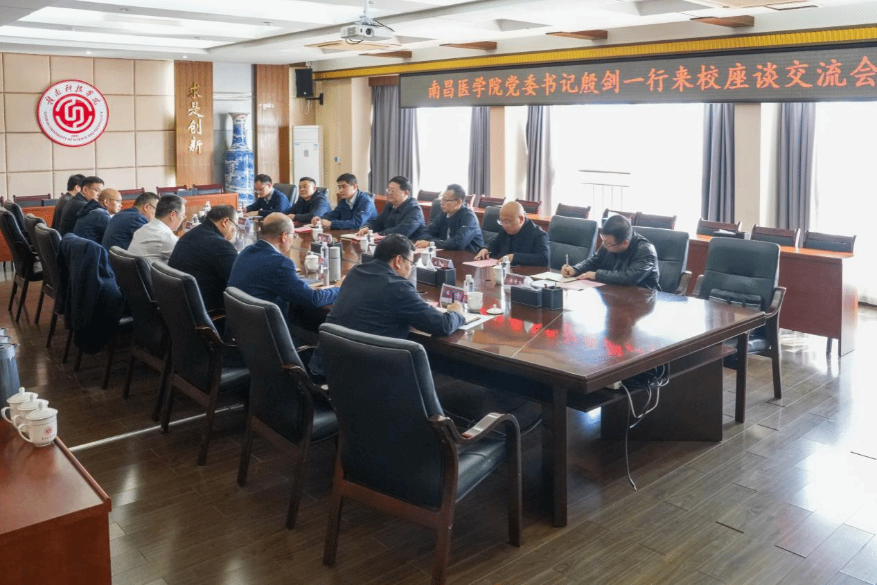 本网讯:12月19日下午,南昌医学院党委书记殷剑、党委副书记彭维杰一行来校考察交流。校党委书记邱建军出席座谈会并致辞,党委副书记、校长邱建丁主持。党委委员、副校长左群,党委委员、组织人事部部长蓝晓植,党委委员、宣传部部长邓亦林出席座谈会。