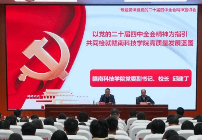 学校党委副书记、校长邱建丁在图书馆报告厅为资源与土木工程学院师生代表宣讲党的二十届四中全会精神。邱建丁围绕“以党的二十届四中全会精神为指引,共同绘就赣南科技学院高质量发展蓝图”主题,从“深刻领会、承前启后、接续奋斗”三个维度,对全会精神进行了系统宣讲和深入阐释,并就贯彻落实学校第一次党代会精神、奋力谱写学校高质量发展新篇章作出部署。邱建丁结合学校第一次党代会确立的“全国知名、省内一流、特色鲜明的高水平应用型大学”总目标和“三步走”战略,号召师生主动融入学校发展蓝图。邱建丁强调,要认清机遇挑战,全力打赢硕士学位授权单位攻坚战,扎实落实“七大行动”,强化党建引领,将宏伟蓝图一步步变为现实,共同谱写学校高质量发展新篇章。