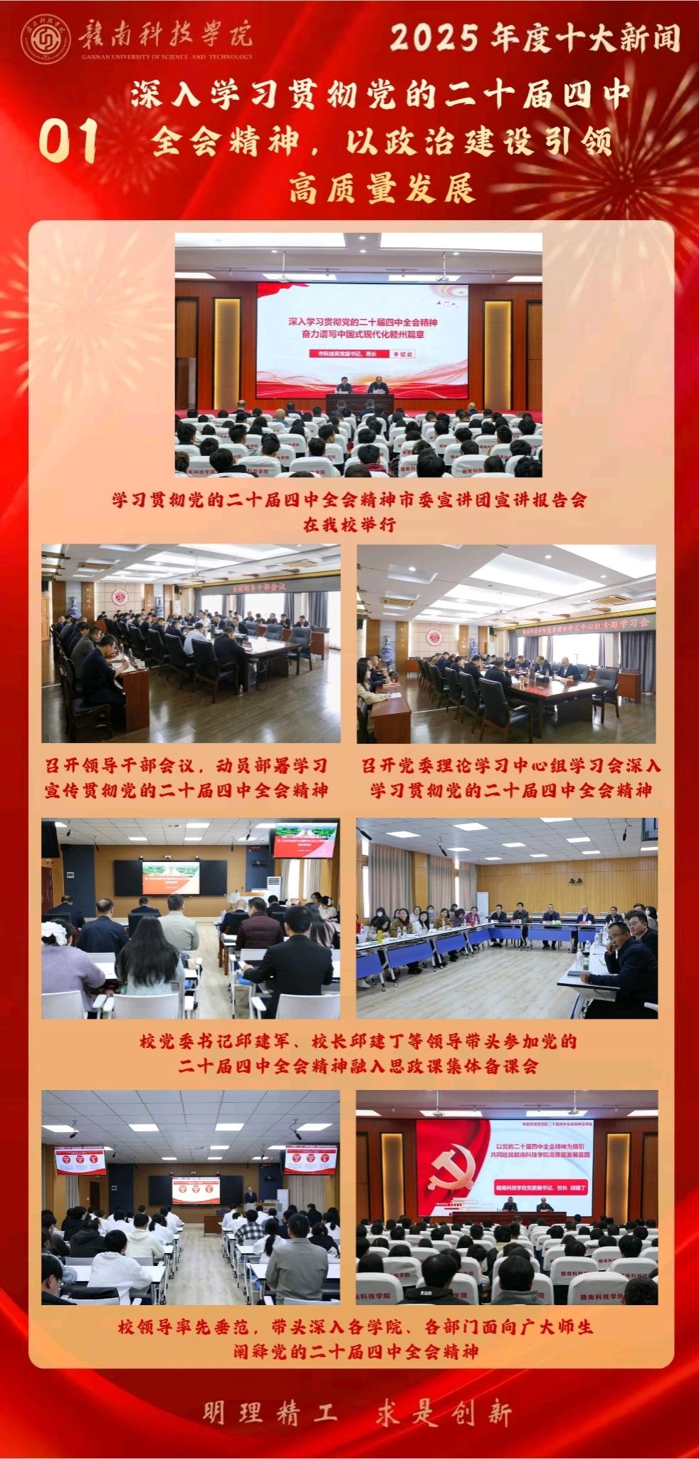 党的二十届四中全会胜利闭幕后,学校党委将学习宣传贯彻全会精神作为首要政治任务,在全校迅速兴起学习热潮。学校通过召开领导干部会议、组织党委理论学习中心组专题学习、举办市委宣讲团报告会等形式,系统推进全会精神的学习贯彻。校党委书记邱建军、校长邱建丁等领导班子成员带头深入课堂参与集体备课,赴各学院、各部门开展宣讲,引导师生深刻领会全会精神的核心要义与实践要求,主动将学习成果融入学校“十五五”发展规划的制定之中,积极对接江西省“1269”及赣州市“7510”行动计划,优化学科专业布局,培育硕士学位点,以高质量党建引领学校事业高质量发展。