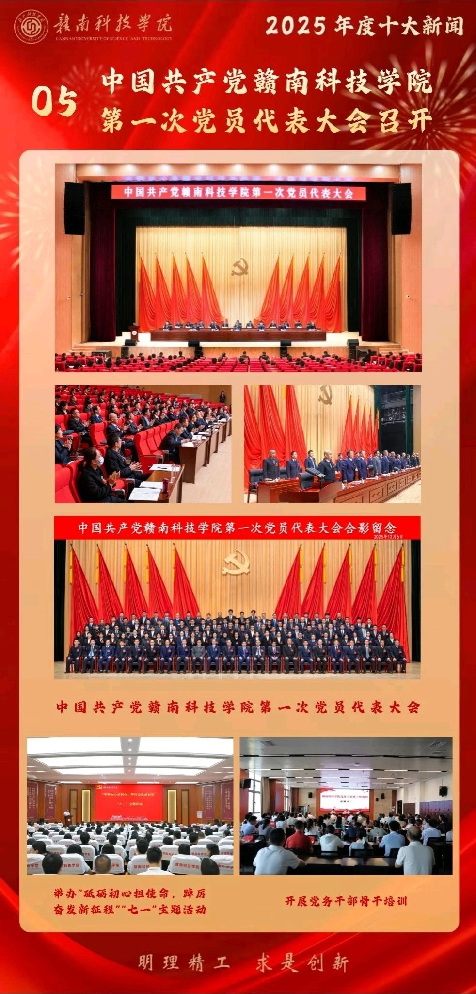 2025年12月5日,中国共产党赣南科技学院第一次党员代表大会隆重开幕。大会全面总结了学校转设以来的发展成就与基本经验,科学绘制了未来发展的“三步走”战略蓝图,确立了建设全国知名、省内一流、特色鲜明的高水平应用型大学的奋斗目标,部署实施“五大战略”和“七大行动”。这次大会是学校政治生活中的一件大事,标志着学校事业发展站上了新起点、开启了新征程。全校上下正将学习贯彻党的二十届四中全会精神与落实党代会各项部署紧密结合,奋力将宏伟蓝图转化为生动实践。