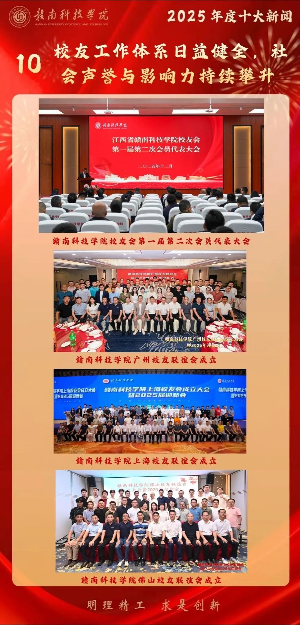 2025年,学校校友工作取得新进展。学校召开了校友会第一届第二次会员代表大会,选举产生了新一届理事会。校友组织网络不断健全,广州、上海、佛山校友联谊会相继成立。优秀校友的卓越表现成为学校闪亮的名片:校友曾明强投身雪域高原,荣获教育部“高校毕业生基层就业卓越奖学金”;校友雷刚在稀贵金属绿色冶炼领域贡献突出,荣获2025年度“新时代青年先锋奖”。广大校友以“上手快、能吃苦、善创新”的特质,使“赣科人”品牌广受社会赞誉。学校的社会美誉度和影响力随着人才培养质量的提升和校友事业的发展而同步提高,形成了母校与校友共同发展的良好局面。