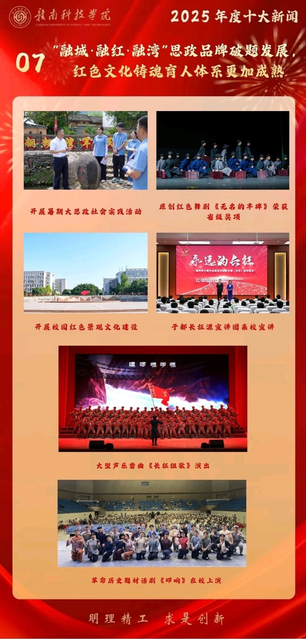 学校持续深化“融城·融红·融湾”思政工作品牌建设,推动红色文化全方位育人。年内邀请长征源宣讲团来校宣讲,引入了大型声乐套曲《长征组歌》、话剧《叩响》等红色精品进校园;学校原创红色舞剧《无名的丰碑》《星星之火》荣获省级奖项、登台“思享荟”,“金沙湾”讲坛举办突破100期,“诵读红色家书”等活动深入人心。思政课改革成效突出,获评省级“一课多师”示范团队等荣誉6项;在省级教学基本功比赛中,获二等奖1项、三等奖3项。实践育人成果丰硕,学校被评为江西省暑期社会实践优秀单位,获优秀调研报告2篇、优秀团队3支等多个奖项。全年组织开展红色主题教育活动270余场,覆盖所有团支部,构建了“课堂+舞台+实践+网络”立体化思政育人新格局。