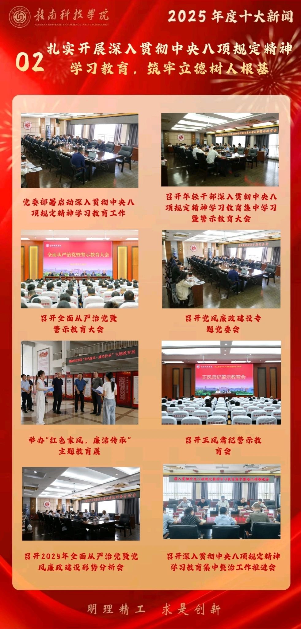 按照中央、省委和市委部署,在全校扎实开展了深入贯彻中央八项规定精神学习教育。通过举办专题读书班、召开警示教育大会、开展联合主题党日活动、组织年轻干部专题学习,以及参观“红色家风”主题教育展览等多种形式,将学习、检视、整改贯穿始终。全校党员干部和教职工的纪律意识、规矩意识得到切实增强,干事创业、担当作为的精气神进一步提振,风清气正的政治生态和育人环境不断巩固,为学校持续健康发展提供了坚强的作风保障。