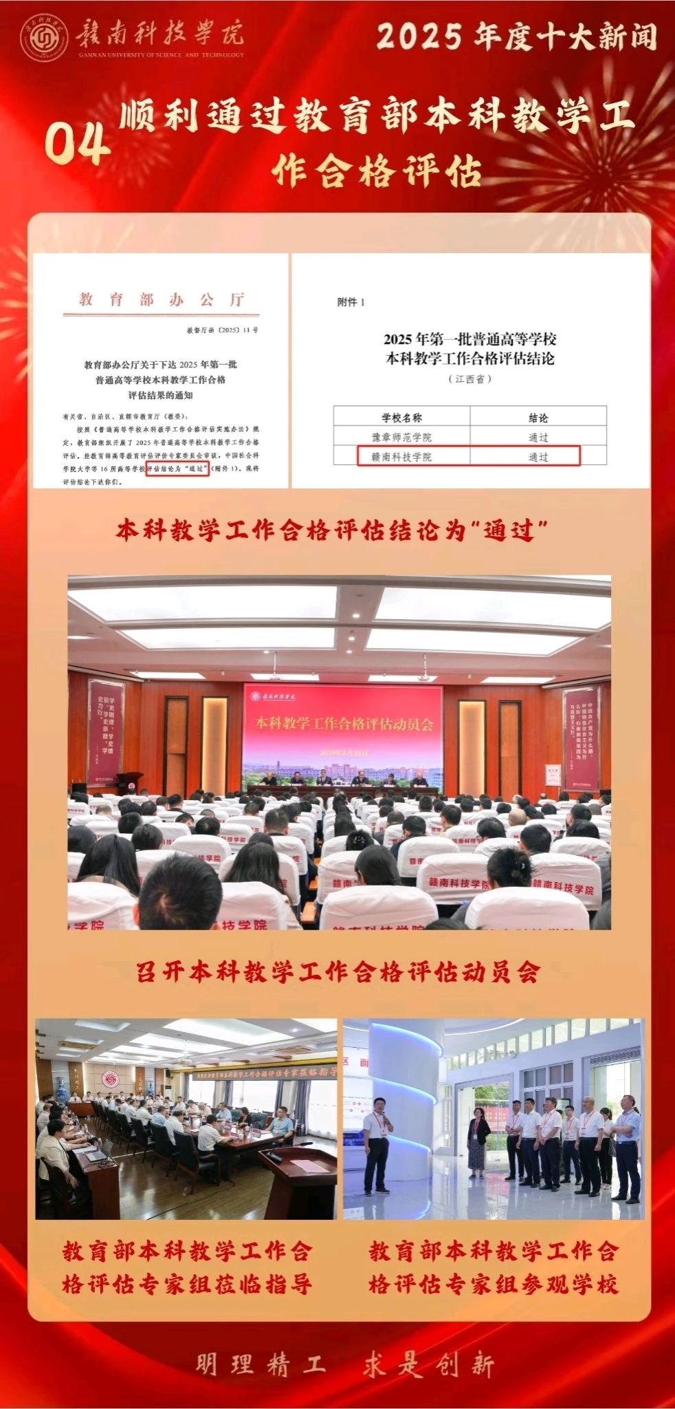 2025年7月,教育部正式下发通知,赣南科技学院本科教学工作合格评估结论为“通过”。标志着学校办学水平和教育教学质量获得了国家权威认可,学校也成为江西省转设高校中首家一次性通过该项评估的本科院校,是学校发展史上的重要里程碑。全校师生将评建工作视为“一号工程”,聚焦办学特色凝练、师资结构优化、教学管理规范和办学条件改善,全面动员、全员参与,高质量完成各项任务。评估通过后,学校持续巩固建设成果,教育教学改革发展成效显著:获批教育部产学研协同育人项目37项,省级教改课题11项,校级教改课题31项,教师在江西省高校教师教学创新大赛中获省级二等奖3项、三等奖2项。学校还系统制定了107条整改措施,建立台账销号制度,推动本科教育教学水平实现系统性跃升。