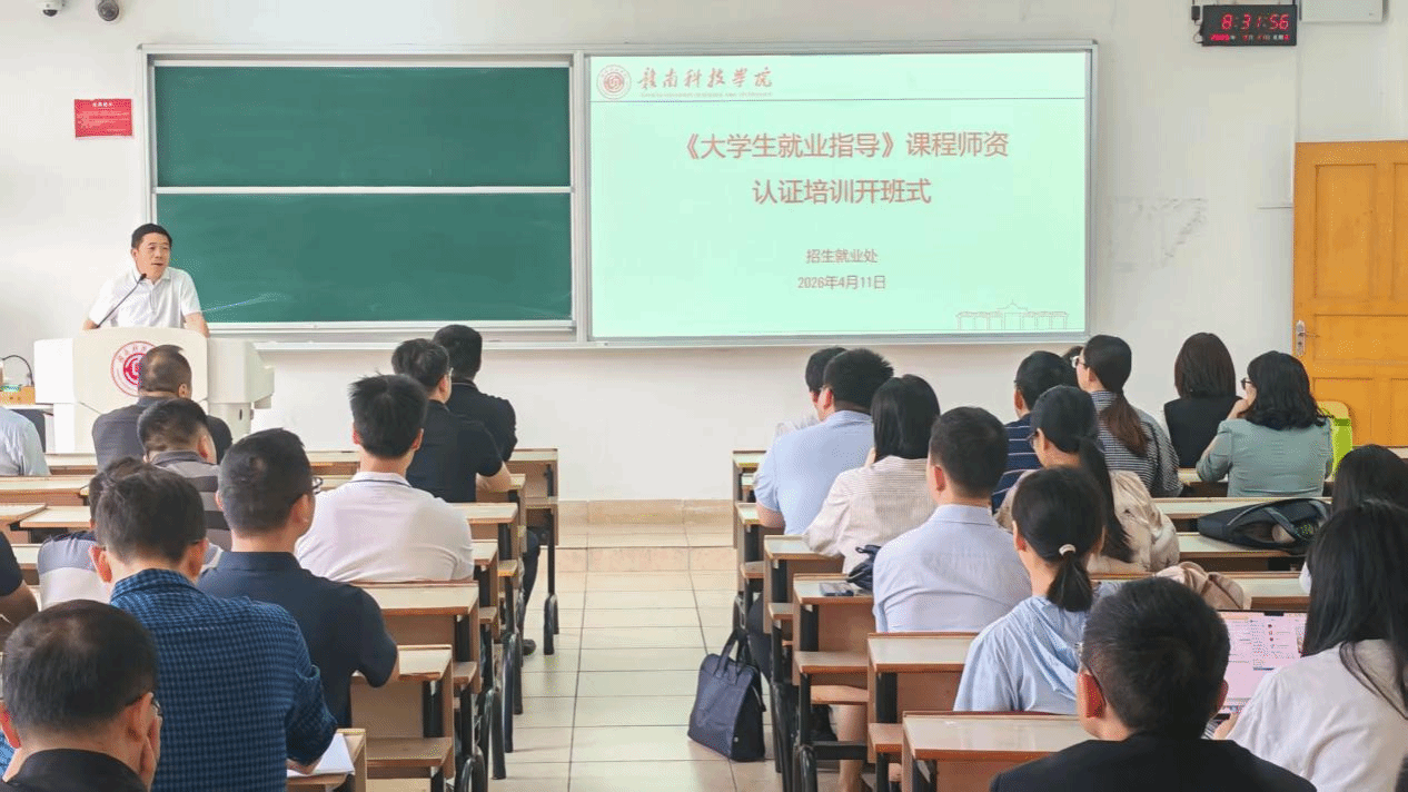 本网讯:4月11日至12日,我校招生就业处联合北森生涯研究院,在学校智慧教室629举办2026年《大学生就业指导》课程教学师资认证培训班。学校党委委员、副校长何锦龙出席开班式并讲话。招生就业处和各学院相关工作人员、2025-2026学年第二学期《大学生就业指导》课程全体任课教师共计60余人参加本次开班式。