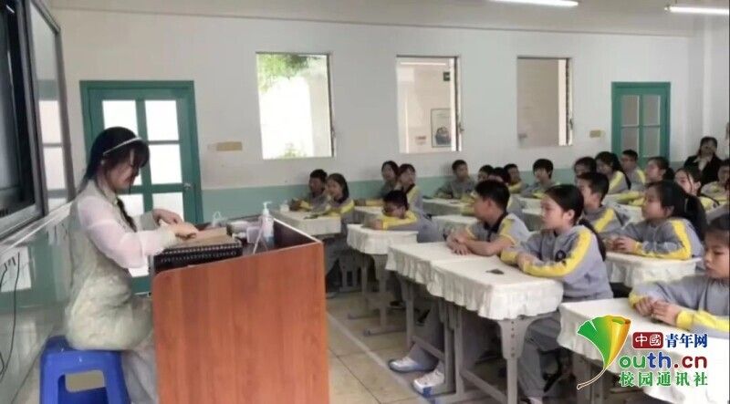 图为赣科志愿者用古筝为学生们弹奏优美动听的《渔舟唱晚》。中国青年网通讯员 袁长龙 摄