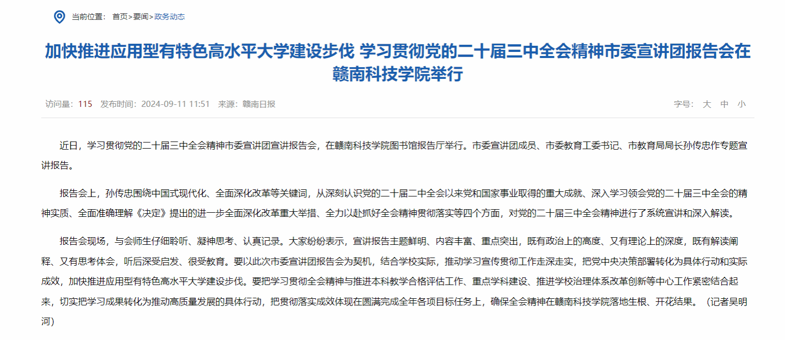 近日,学习贯彻党的二十届三中全会精神市委宣讲团宣讲报告会,在赣南科技学院图书馆报告厅举行。市委宣讲团成员、市委教育工委书记、市教育局局长孙传忠作专题宣讲报告。