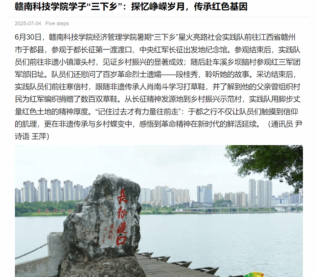 6月30日,赣南科技学院经济管理学院暑期“三下乡”星火亮路社会实践队前往江西省赣州市于都县,参观于都长征第一渡渡口、中央红军长征出发地纪念馆。参观结束后,实践队员们前往非遗小镇潭头村,见证乡村振兴的显著成效;随后赴车溪乡坝脑村参观红三军团军部旧址。队员们还慰问了百岁革命烈士遗孀——段桂秀,聆听她的故事。采访结束后,实践队员们前往寒信村,跟随非遗传承人肖南斗学习打草鞋,并了解到他的父亲曾组织村民为红军编织捐赠了数百双草鞋。从长征精神发源地到乡村振兴示范村,实践队用脚步丈量红色土地的精神厚度。“记住过去才有力量往前走”:于都之行不仅让队员们触摸到信仰的肌理,更在非遗传承与乡村蝶变中,感悟到革命精神在新时代的鲜活延续。(通讯员 尹诗语 王萍)