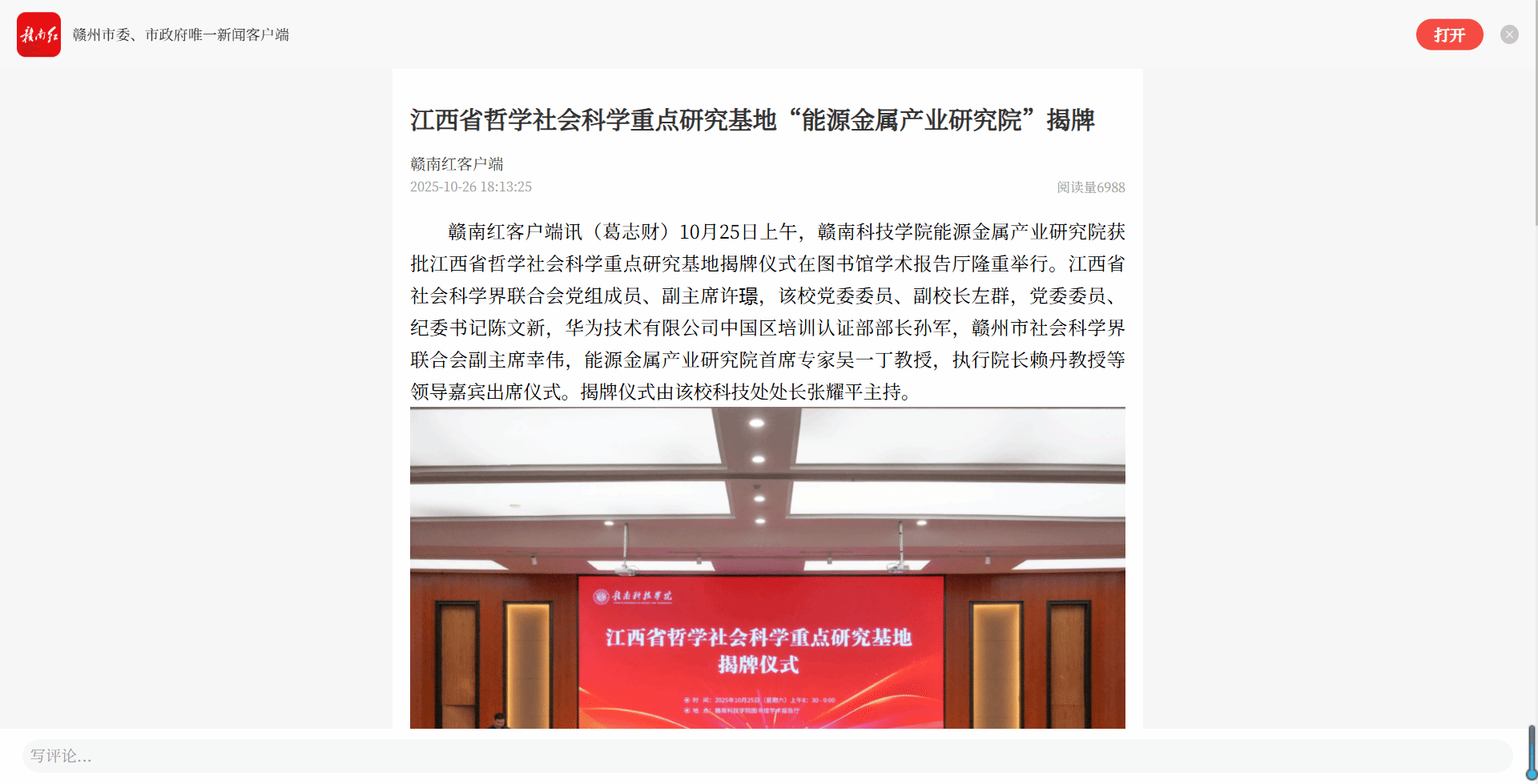 赣南红客户端讯(葛志财)10月25日上午,赣南科技学院能源金属产业研究院获批江西省哲学社会科学重点研究基地揭牌仪式在图书馆学术报告厅隆重举行。江西省社会科学界联合会党组成员、副主席许璟,该校党委委员、副校长左群,党委委员、纪委书记陈文新,华为技术有限公司中国区培训认证部部长孙军,赣州市社会科学界联合会副主席幸伟,能源金属产业研究院首席专家吴一丁教授,执行院长赖丹教授等领导嘉宾出席仪式。揭牌仪式由该校科技处处长张耀平主持。