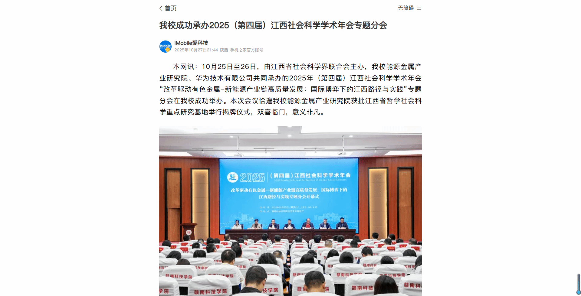 本网讯:10月25日至26日,由江西省社会科学界联合会主办,我校能源金属产业研究院、华为技术有限公司共同承办的2025年(第四届)江西社会科学学术年会“改革驱动有色金属-新能源产业链高质量发展:国际博弈下的江西路径与实践”专题分会在我校成功举办。本次会议恰逢我校能源金属产业研究院获批江西省哲学社会科学重点研究基地举行揭牌仪式,双喜临门,意义非凡。