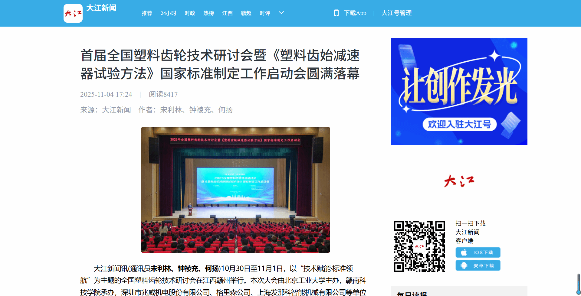 大江新闻讯(通讯员宋利林、钟祾充、何扬)10月30日至11月1日,以“技术赋能·标准领航”为主题的全国塑料齿轮技术研讨会在江西赣州举行。本次大会由北京工业大学主办,赣南科技学院承办,深圳市兆威机电股份有限公司、格里森公司、上海发那科智能机械有限公司等单位共同协办。
