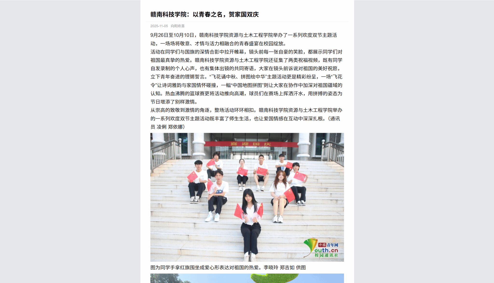 从崇高的致敬到激情的角逐,整场活动环环相扣。赣南科技学院资源与土木工程学院举办的一系列欢度双节主题活动既丰富了师生生活,也让爱国情感在互动中深深扎根。(通讯员 凌俐 郑依娜)