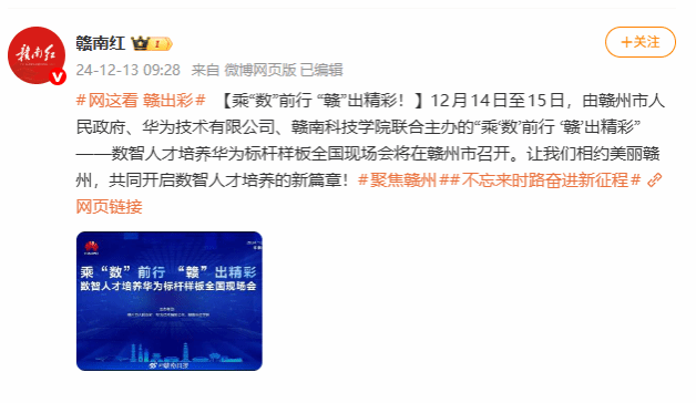【乘“数”前行 “赣”出精彩!】12月14日至15日,由赣州市人民政府、华为技术有限公司、赣南科技学院联合主办的“乘‘数’前行 ‘赣’出精彩”——数智人才培养华为标杆样板全国现场会将在赣州市召开。让我们相约美丽赣州,共同开启数智人才培养的新篇章