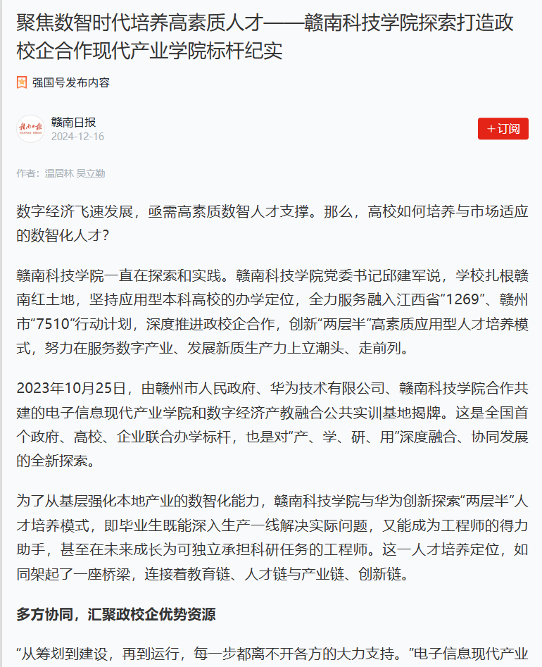 2023年10月25日,由赣州市人民政府、华为技术有限公司、赣南科技学院合作共建的电子信息现代产业学院和数字经济产教融合公共实训基地揭牌。这是全国首个政府、高校、企业联合办学标杆,也是对“产、学、研、用”深度融合、协同发展的全新探索。