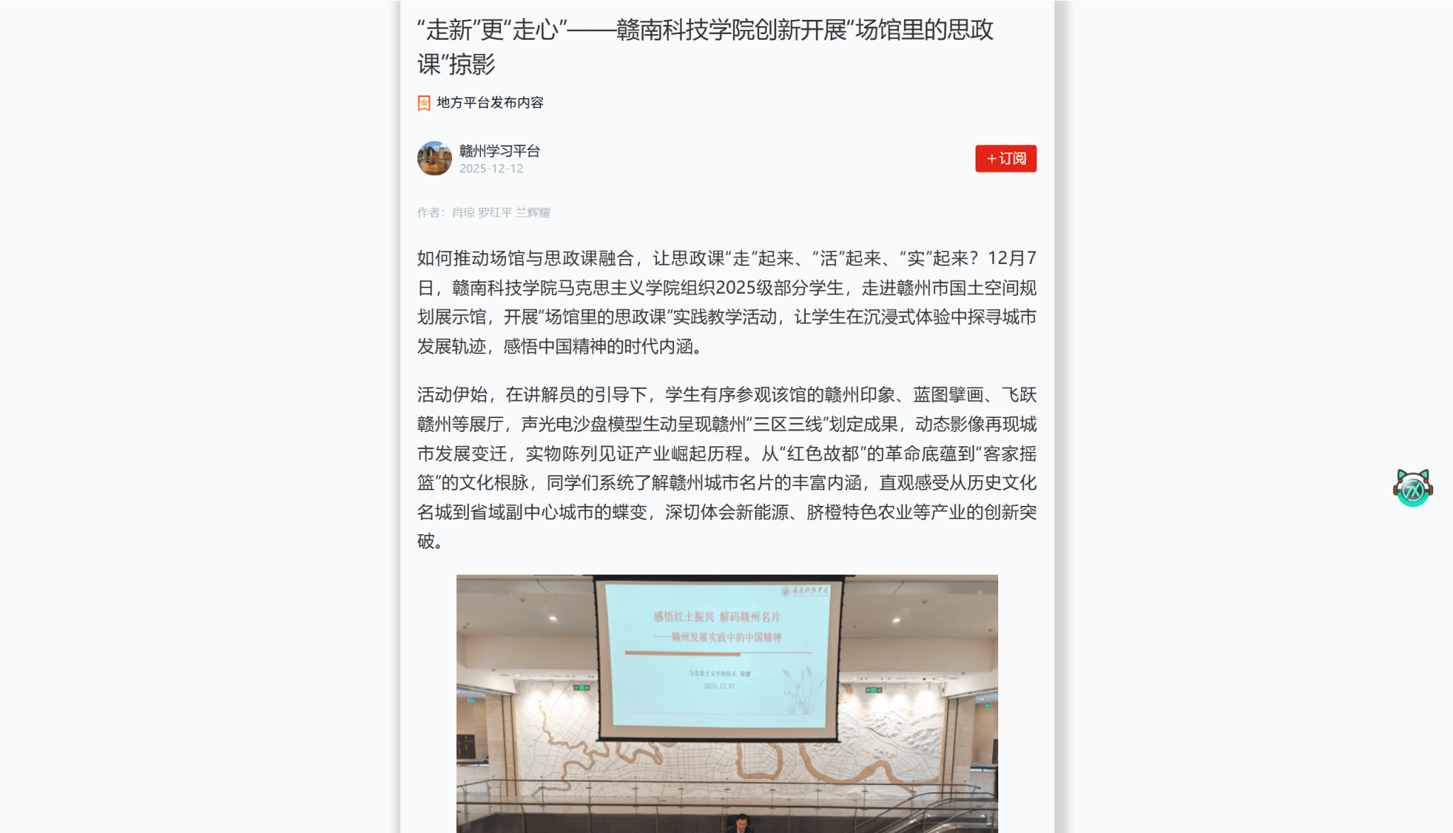 如何推动场馆与思政课融合,让思政课“走”起来、“活”起来、“实”起来?12月7日,赣南科技学院马克思主义学院组织2025级部分学生,走进赣州市国土空间规划展示馆,开展“场馆里的思政课”实践教学活动,让学生在沉浸式体验中探寻城市发展轨迹,感悟中国精神的时代内涵。