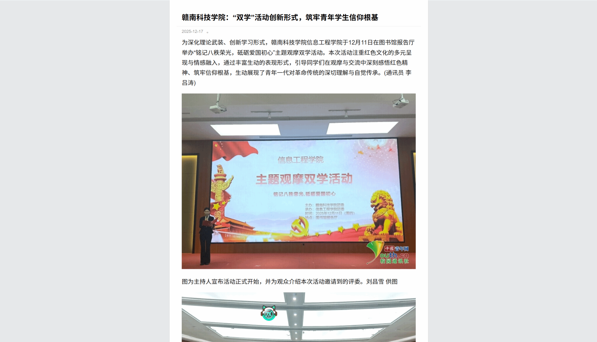 为深化理论武装、创新学习形式,赣南科技学院信息工程学院于12月11日在图书馆报告厅举办“铭记八秩荣光,砥砺爱国初心”主题观摩双学活动。本次活动注重红色文化的多元呈现与情感融入,通过丰富生动的表现形式,引导同学们在观摩与交流中深刻感悟红色精神、筑牢信仰根基,生动展现了青年一代对革命传统的深切理解与自觉传承。(通讯员 李吕涛)