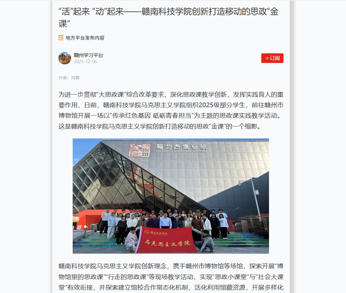 为进一步贯彻“大思政课”综合改革要求,深化思政课教学创新,发挥实践育人的重要作用,日前,赣南科技学院马克思主义学院组织2025级部分学生,前往赣州市博物馆开展一场以“传承红色基因 砥砺青春担当”为主题的思政课实践教学活动。这是赣南科技学院马克思主义学院创新打造移动的思政“金课”的一个缩影。