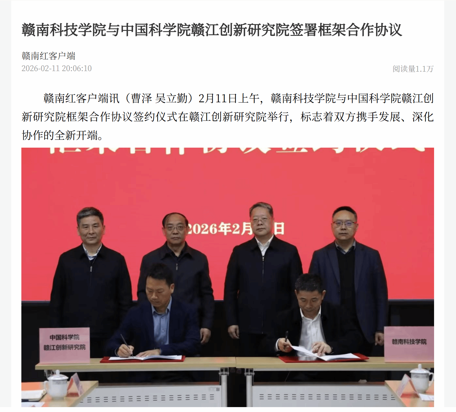 赣南红客户端讯(曹泽 吴立勤)2月11日上午,赣南科技学院与中国科学院赣江创新研究院框架合作协议签约仪式在赣江创新研究院举行,标志着双方携手发展、深化协作的全新开端。
