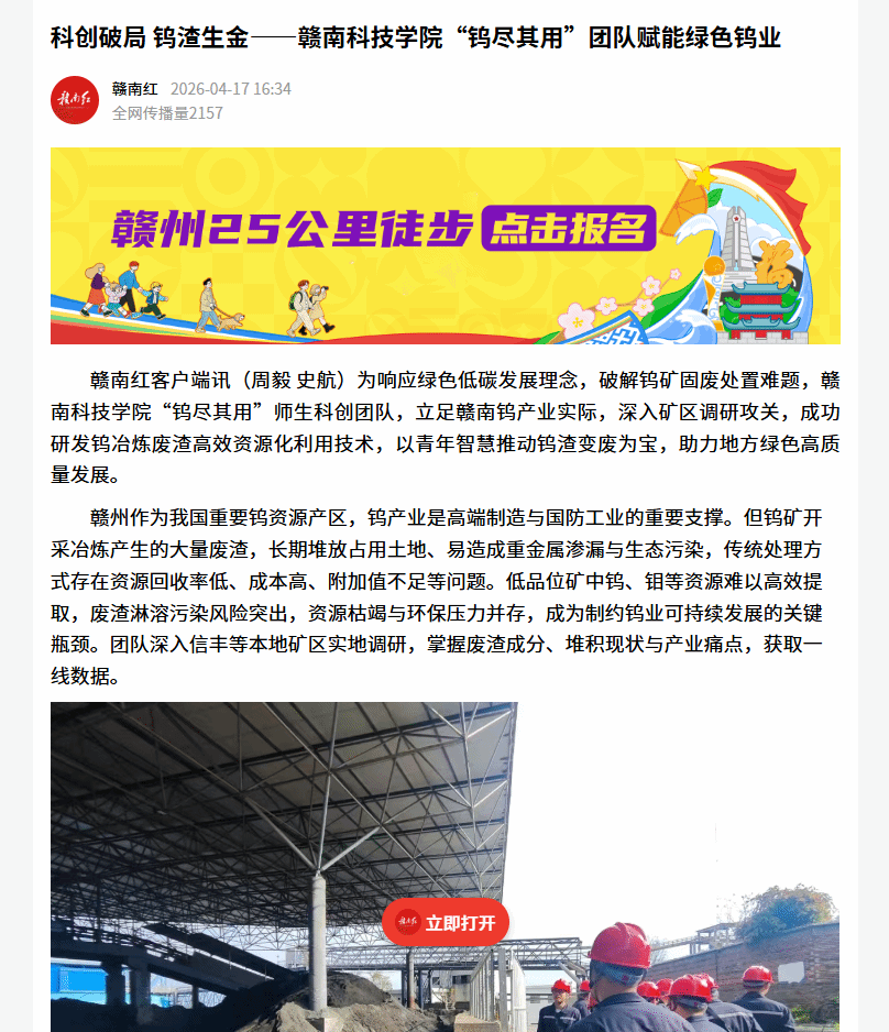赣南红客户端讯(周毅 史航)为响应绿色低碳发展理念,破解钨矿固废处置难题,赣南科技学院“钨尽其用”师生科创团队,立足赣南钨产业实际,深入矿区调研攻关,成功研发钨冶炼废渣高效资源化利用技术,以青年智慧推动钨渣变废为宝,助力地方绿色高质量发展。
