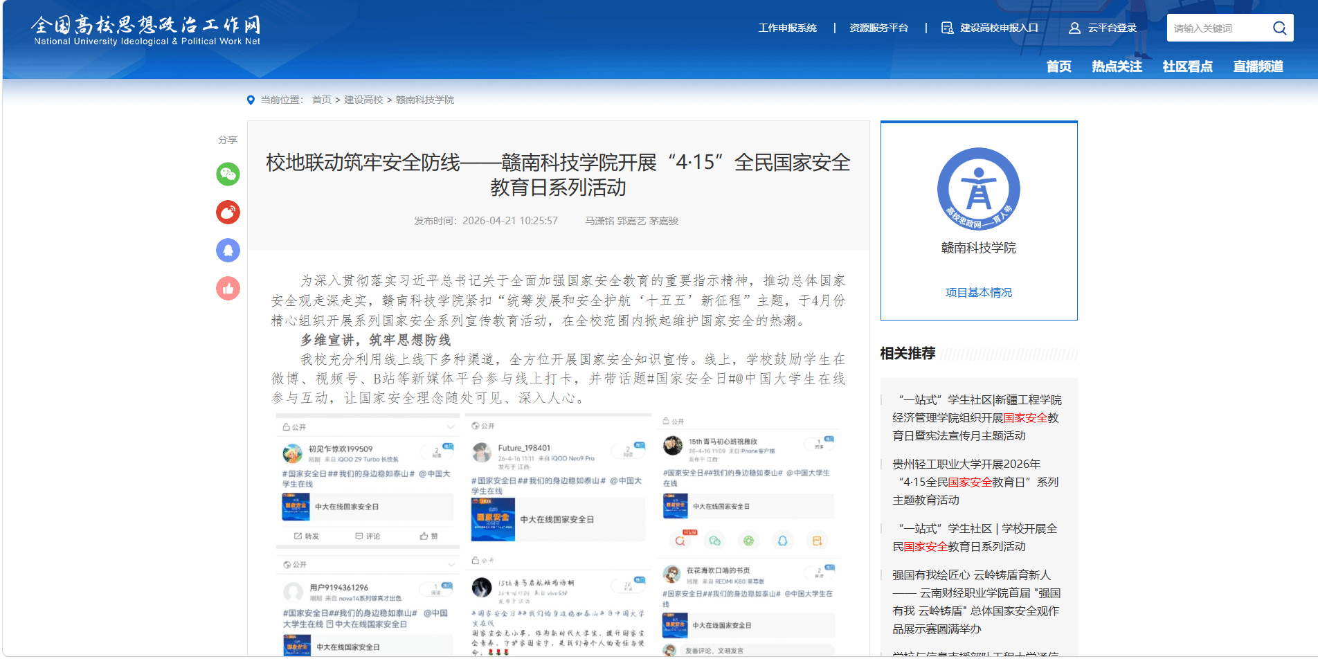 为深入贯彻落实习近平总书记关于全面加强国家安全教育的重要指示精神,推动总体国家安全观走深走实,赣南科技学院紧扣“统筹发展和安全护航‘十五五’新征程”主题,于4月份精心组织开展系列国家安全系列宣传教育活动,在全校范围内掀起维护国家安全的热潮。