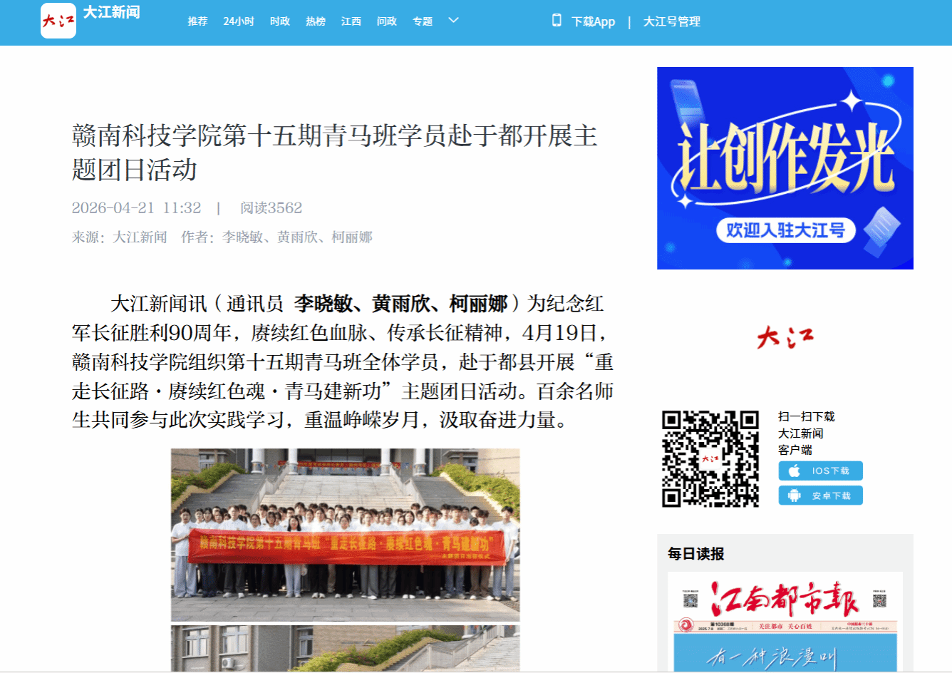 大江新闻讯(通讯员 李晓敏、黄雨欣、柯丽娜)为纪念红军长征胜利90周年,赓续红色血脉、传承长征精神,4月19日,赣南科技学院组织第十五期青马班全体学员,赴于都县开展“重走长征路·赓续红色魂·青马建新功”主题团日活动。百余名师生共同参与此次实践学习,重温峥嵘岁月,汲取奋进力量。