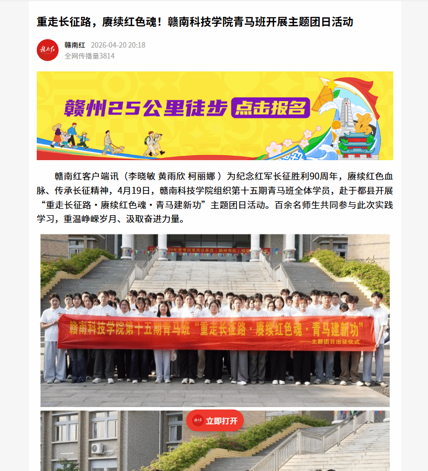 赣南红客户端讯(李晓敏 黄雨欣 柯丽娜 )为纪念红军长征胜利90周年,赓续红色血脉、传承长征精神,4月19日,赣南科技学院组织第十五期青马班全体学员,赴于都县开展“重走长征路·赓续红色魂·青马建新功”主题团日活动。百余名师生共同参与此次实践学习,重温峥嵘岁月、汲取奋进力量。