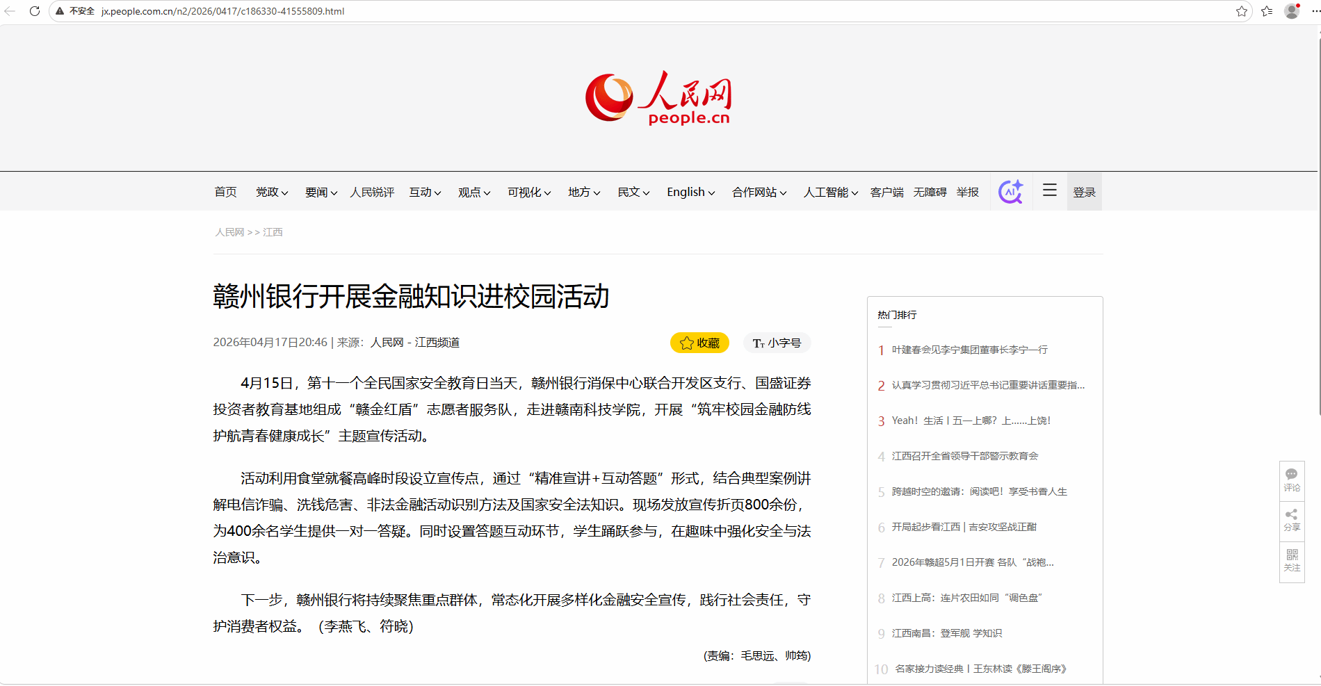 4月15日,第十一个全民国家安全教育日当天,赣州银行消保中心联合开发区支行、国盛证券投资者教育基地组成“赣金红盾”志愿者服务队,走进赣南科技学院,开展“筑牢校园金融防线 护航青春健康成长”主题宣传活动。