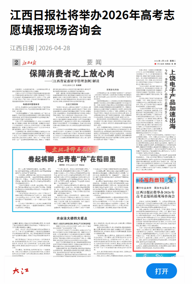 本报讯 (全媒体记者李芳)一年一度的高考即将来临。为帮助我省广大考生科学填报高考志愿,江西日报社继2024年、2025年举办两届高招咨询会后,今年将继续举办“江报有高招·江西省2026年高考志愿填报现场咨询会”。