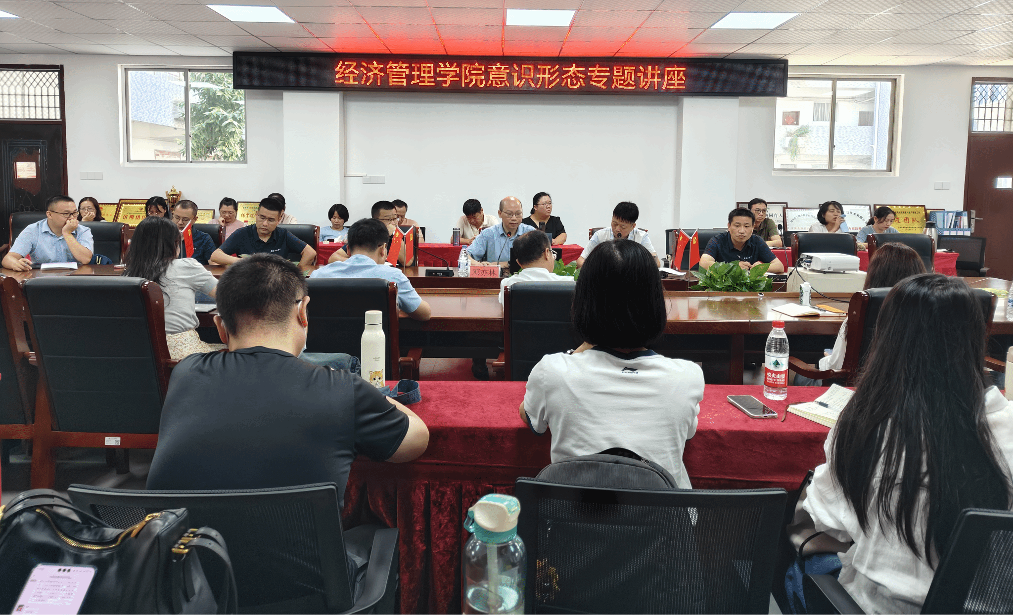 本网讯:9月28日,学校党委委员、宣传部部长邓亦林应邀在经济管理学院作了题为《坚持立德树人初心 筑牢意识形态安全防线——新时代高校教师的责任与担当》的意识形态专题讲座。经济管理学院领导班子成员、全体教职工聆听,讲座由经济管理学院党委书记肖永鸿主持。