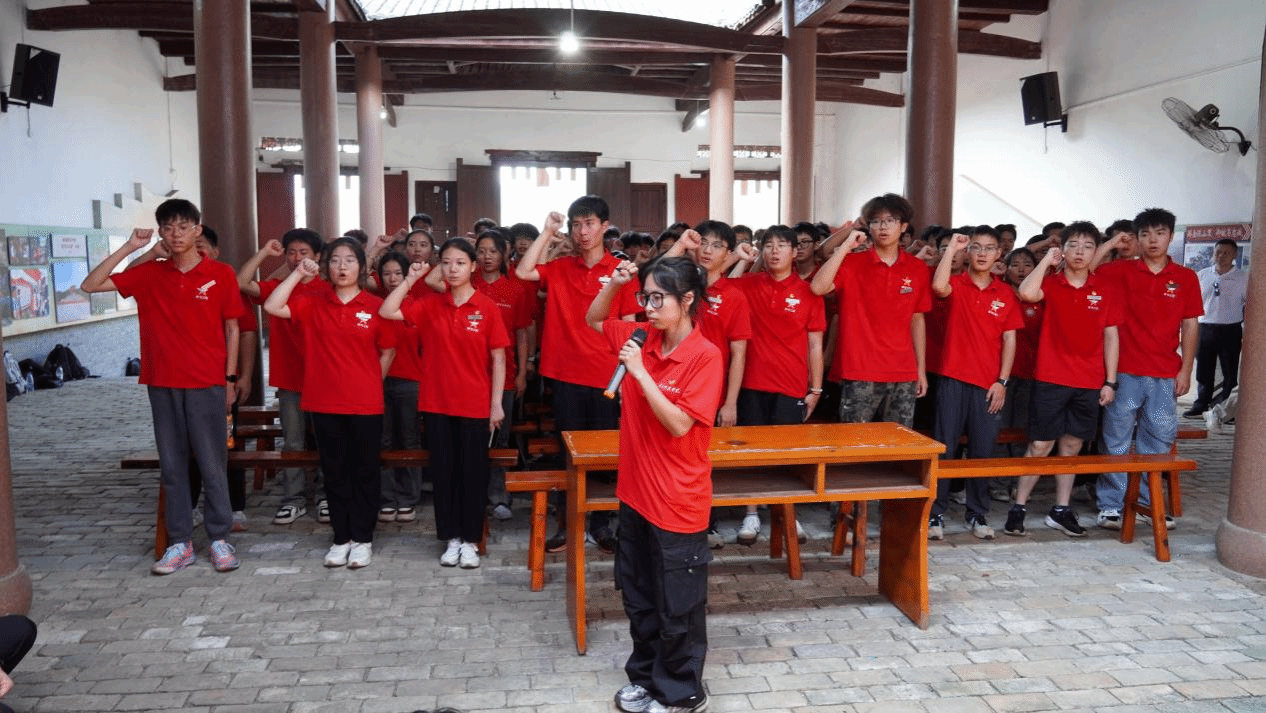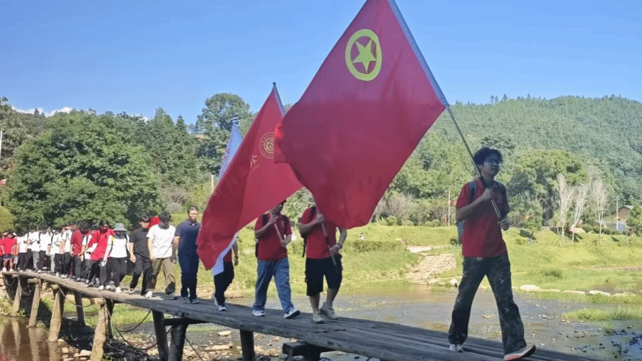 活动当天,师生队伍从红军长征小道起点广场整装出发,开启一场跨越时空的精神洗礼。大家循着革命先辈的足迹,先后跨越简易杉木搭建的金沙桥,途经红五军团前线军医处、思源井、登贤桥等;在青山绿水间聆听长征故事,在历史现场感悟革命初心。在登贤县苏维埃政府旧址,全体学员面向团旗肃立,庄严重温入团誓词。铿锵有力的誓言久久回荡,既彰显了青年学子传承红色基因的坚定决心,也进一步筑牢了理想信念根基。