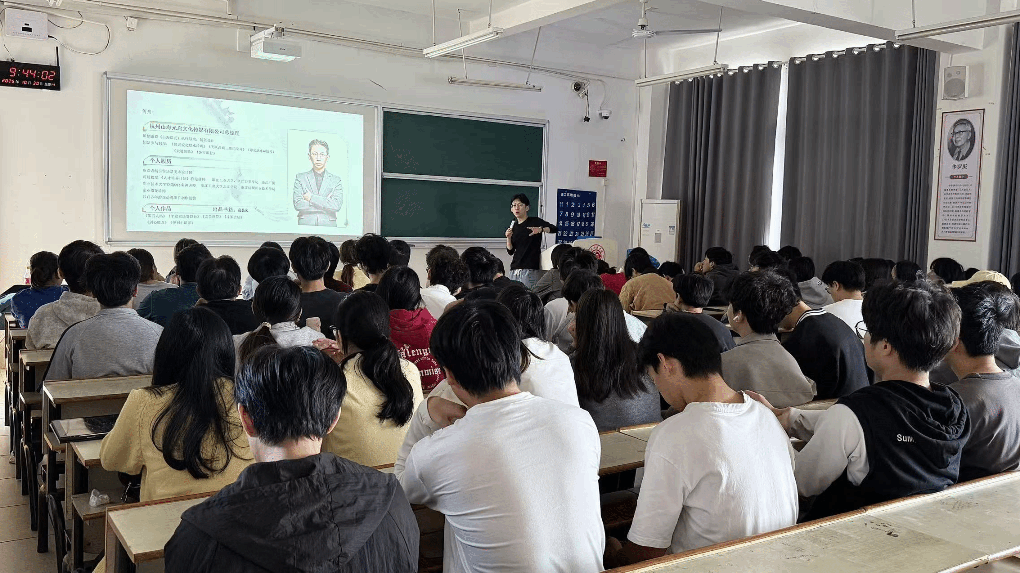 本网讯:10月30日上午,文法学院特邀杭州山海元启文化传媒有限公司总经理蒋舟先生以“数字创作领域的多维探索与未来展望”为主题来校开展专题讲座。讲座聚焦游戏、影视、动画等热门领域,围绕技术、商业、跨界、生态、艺术、设计六大维度展开深度分享,吸引我校数字媒体技术、动画、游戏设计等相关专业数百名师生到场聆听。