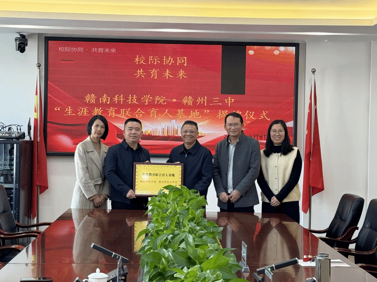 本网讯:12月8日上午,我校与赣州市第三中学“生涯教育联合育人基地”揭牌仪式在赣州三中行政楼六楼会议室举行。赣州三中党委书记罗招荣,副校长孙金元,我校招生就业处副处长杨智勇,职业发展促进中心主任汤春琳共同参加揭牌仪式。