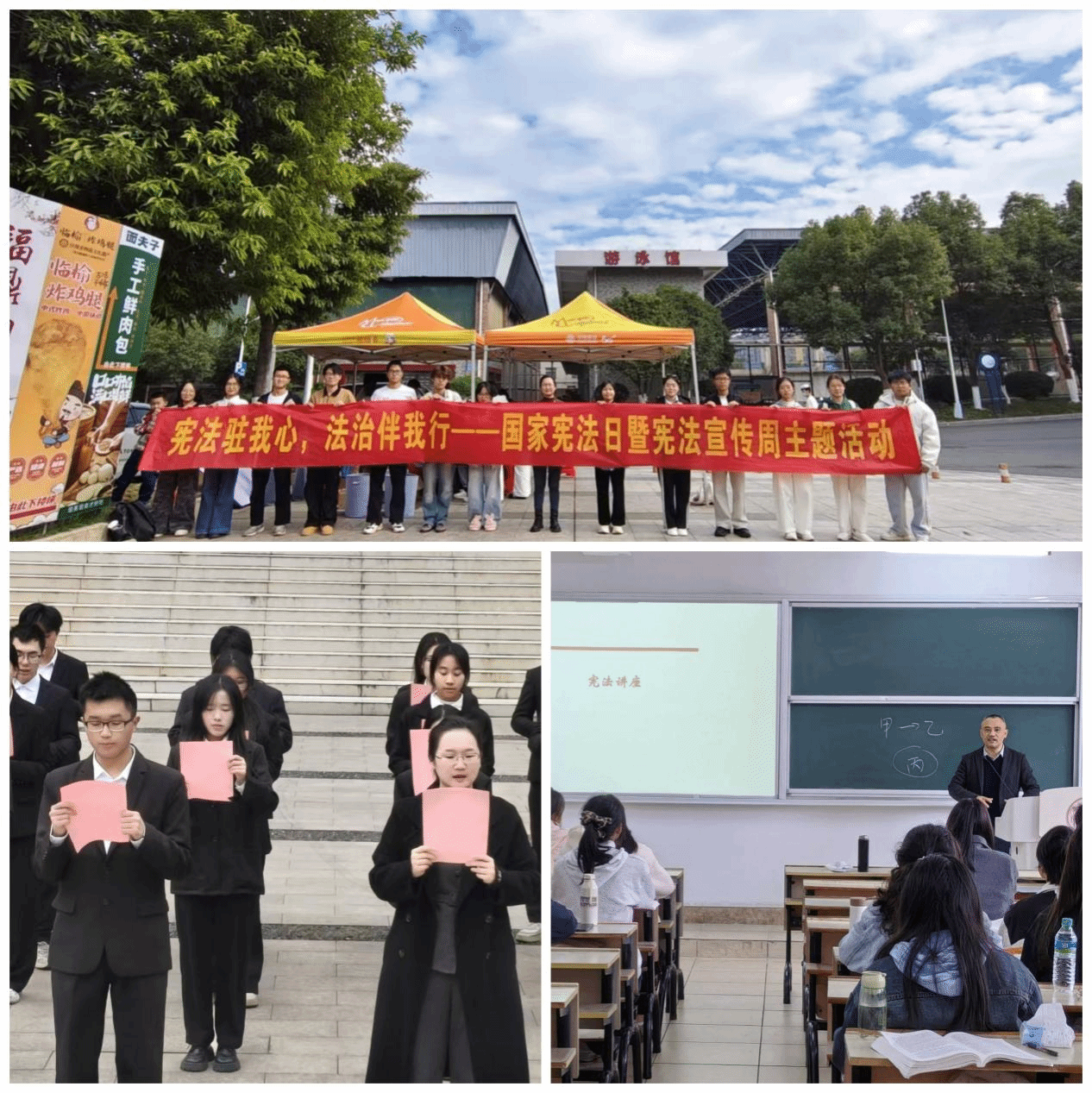 校内活动形式多样且成效显著。12月2日,普法社在食堂门口设互动展区,通过“普法飞行棋”“宪法知识速答”等趣味游戏,让同学们在寓教于乐中普及宪法知识、提升法治素养;12月4日,在指导老师刘翛然带领下,师生于主教学楼前开展宪法晨读活动,在诵读中感悟宪法庄严,强化尊宪守法自觉;同日,法学教师龚云辉受邀开展宪法主题宣讲,系统阐释宪法核心地位与基本原则,助力师生夯实法治信仰理论根基。
