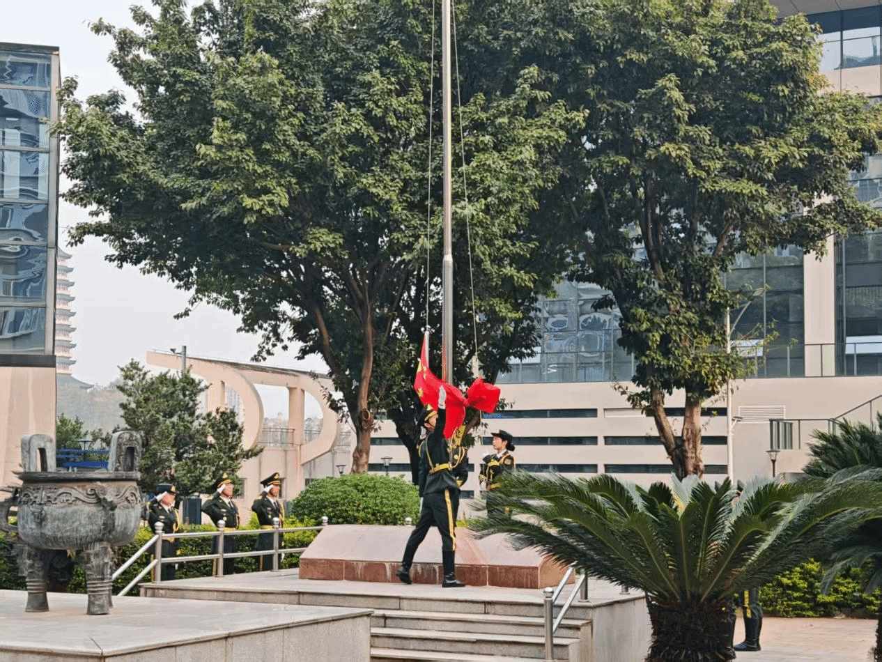 伴随着雄壮的《义勇军进行曲》,国旗护卫队迈着铿锵有力的步伐护送国旗入场。全体师生肃立注目,五星红旗在晨光中冉冉升起,迎风飘扬,现场庄严肃穆。