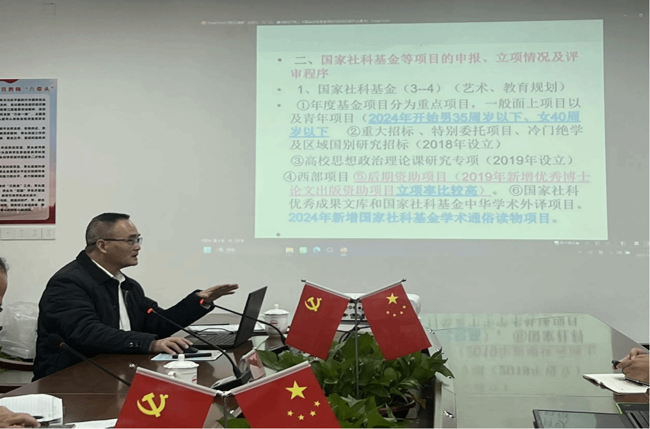 随后,何瑞鑫详细解读了国家社科基金项目的申报流程、立项现状及评审程序。他结合最新政策文件,梳理了从申报材料准备、院系审核、学校推荐到全国通讯评审、会议评审的全流程要点,重点强调了申报时间节点与材料规范性要求。同时,他通过数据对比分析了近年全国及我省相关项目的立项趋势,指出当前立项工作更侧重研究的现实意义与创新价值,为教师申报方向提供了参考。