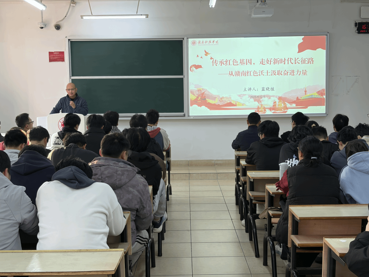 授课中,蓝晓植从赣南深厚的红色历史切入,深情讲述了赣南作为中央苏区核心区域和长征出发地的革命历史。他指出,这片红土地承载着厚重的革命记忆,蕴藏着独特的红色资源,是当代青年汲取信念力量、补足精神之钙的重要源泉。通过回顾革命先烈的感人事迹与长征故事,蓝晓植深刻阐释了“信念如磐”的精神内核,勉励同学们要铭记历史,树立远大理想,厚植深厚家国情怀。