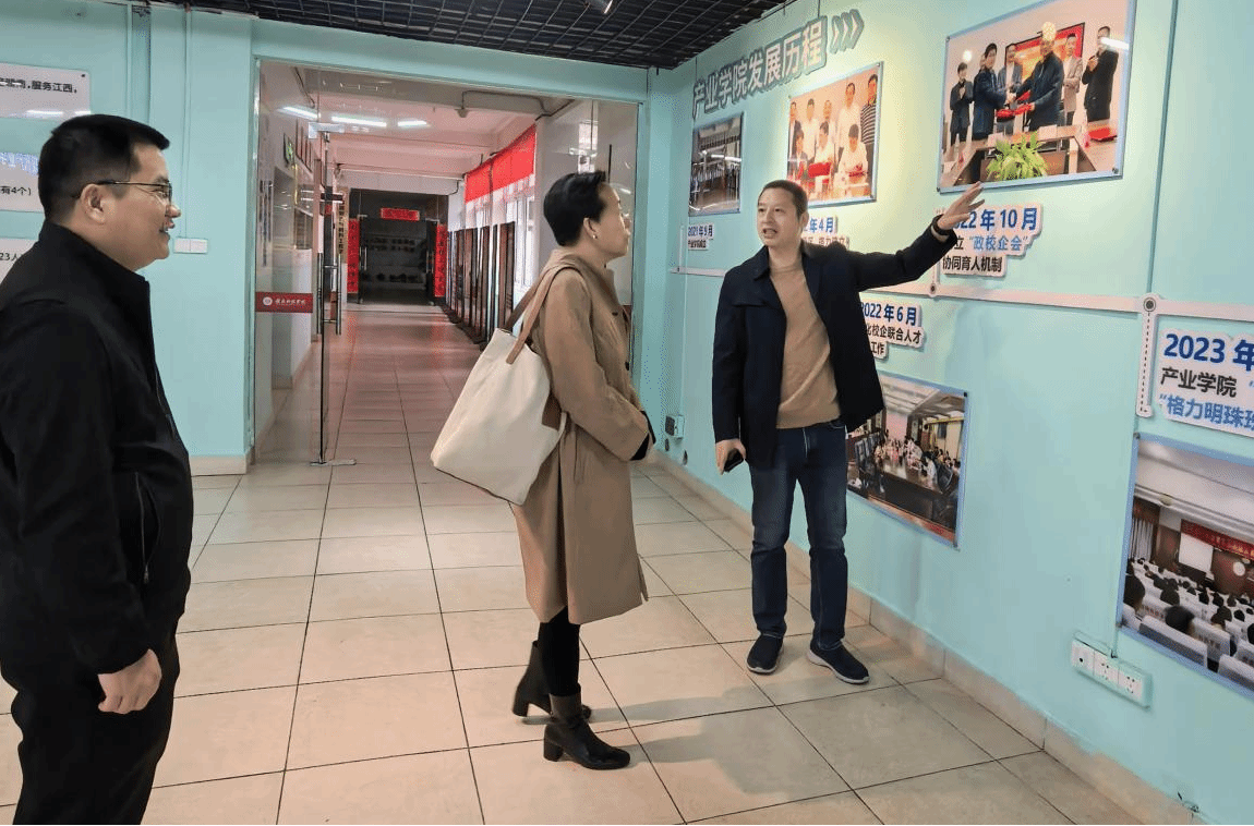 冯慧芳一行参观了智能制造现代产业学院,刘辉详细介绍了智能制造现代产业学院的建设理念、产教融合人才培养模式及“照耀齿轮班”的发展历程和实践成效。