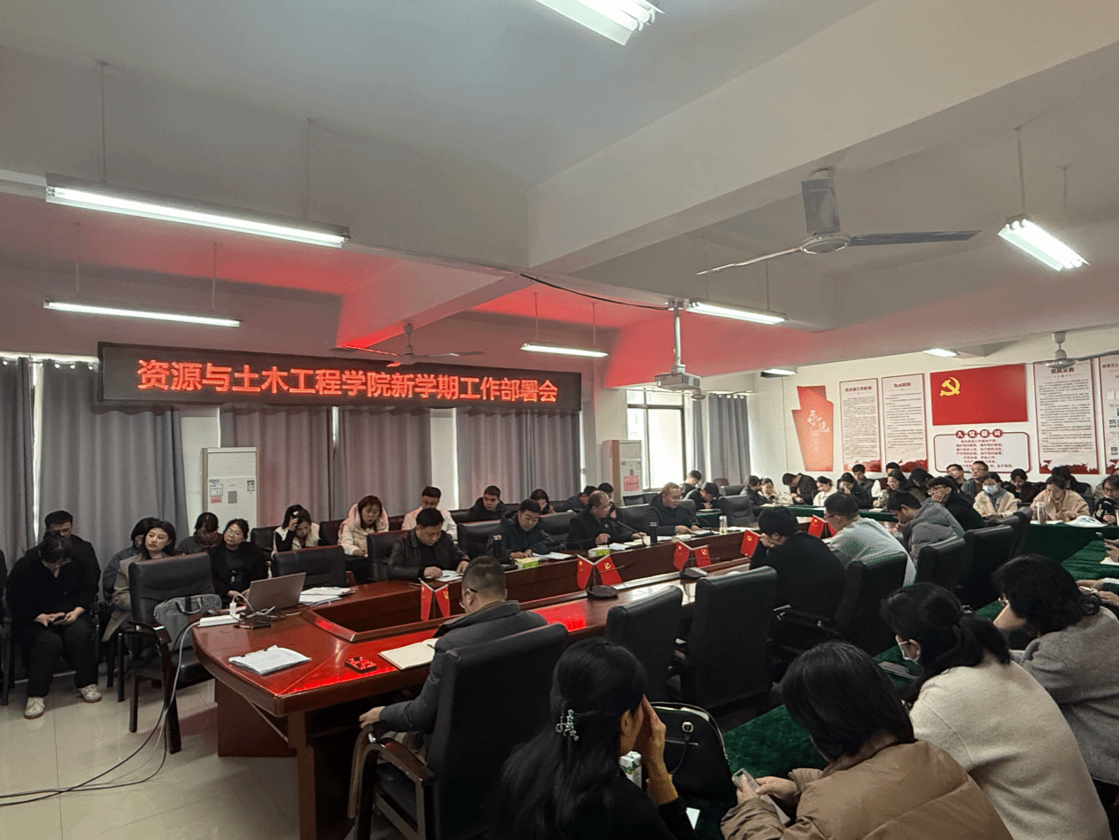 开好教职工大会,锚定发展方向。3月7日下午,资源与土木工程学院在逸夫楼A505会议室召开新学期工作部署会,学院全体教职工参会,学院党委书记刘俊峰主持会议。会议首先组织政治理论学习,杨靖同志领学2026年全国两会会议精神及重点议程,让全体教职工及时把握时政要点,凝聚思想共识。代靖怡同志领学《赣南科技学院调(停)课管理规定》,涂黎明同志领学《赣南科技学院校园交通安全提示》,进一步规范教学管理与校园安全行为。在工作布置环节,会议围绕新学期教学资料准备及检查、实验室开放、第一周授课检查、毕业设计、补考考风考纪等教学重点工作作出详细安排;对新学期学生管理和就业工作进行部署,并强调教师科研、专业发展和学科建设等规划部署。