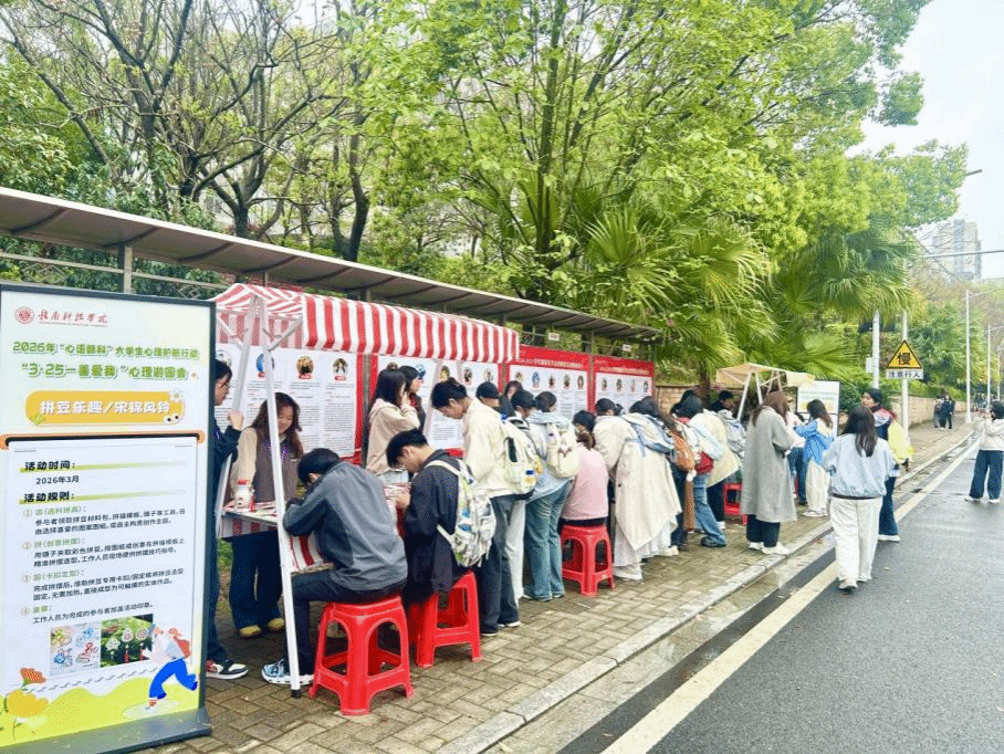 本网讯:3月24日,学工处在食堂门口举办2026年“心语赣科”心理护航行动“3·25—善爱我”心理游园会。活动深入贯彻新时代高校心理健康教育工作要求,践行“善爱我”育人理念,学子踊跃参与,在沉浸式互动中舒缓压力、疗愈心灵。
