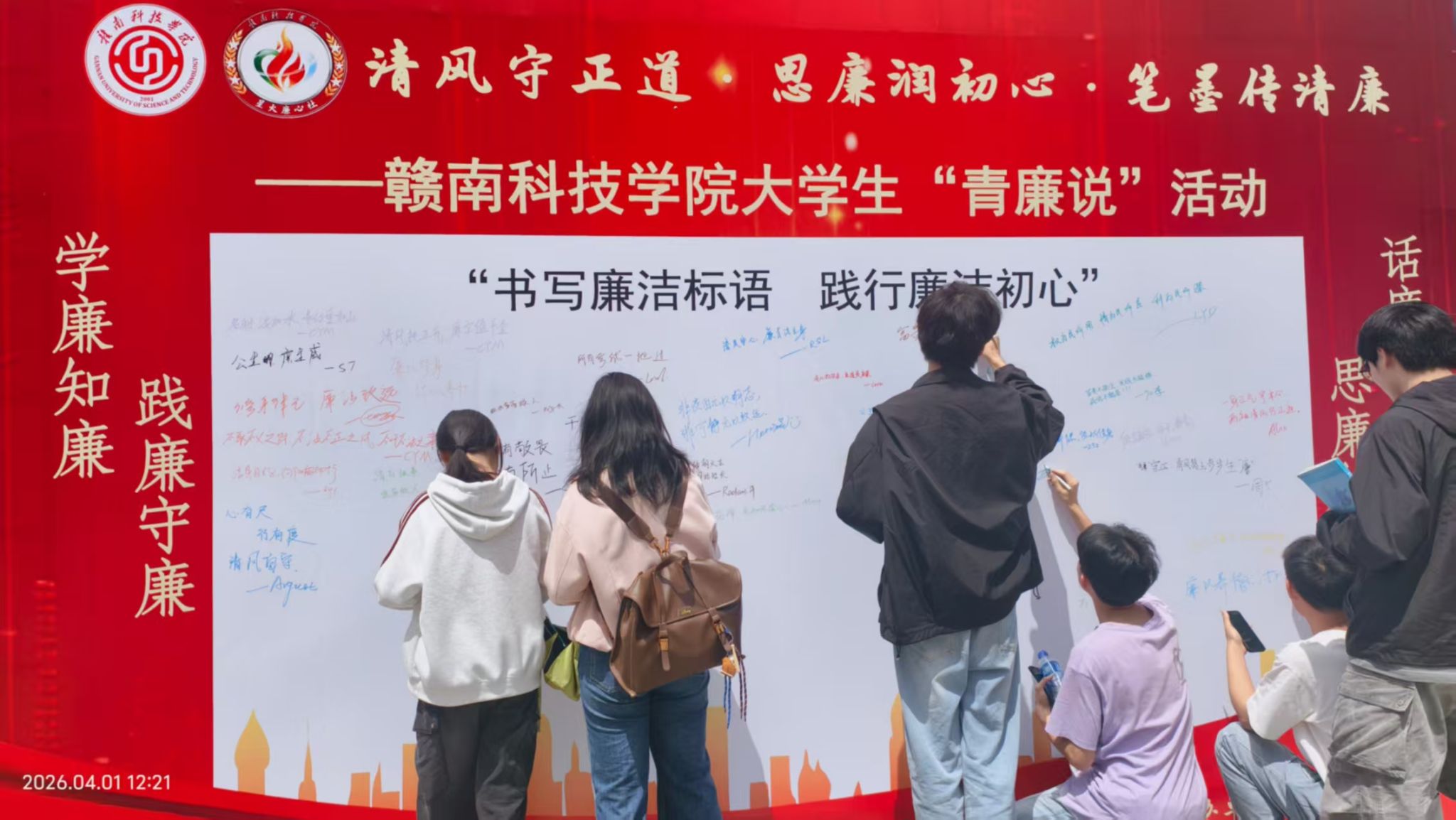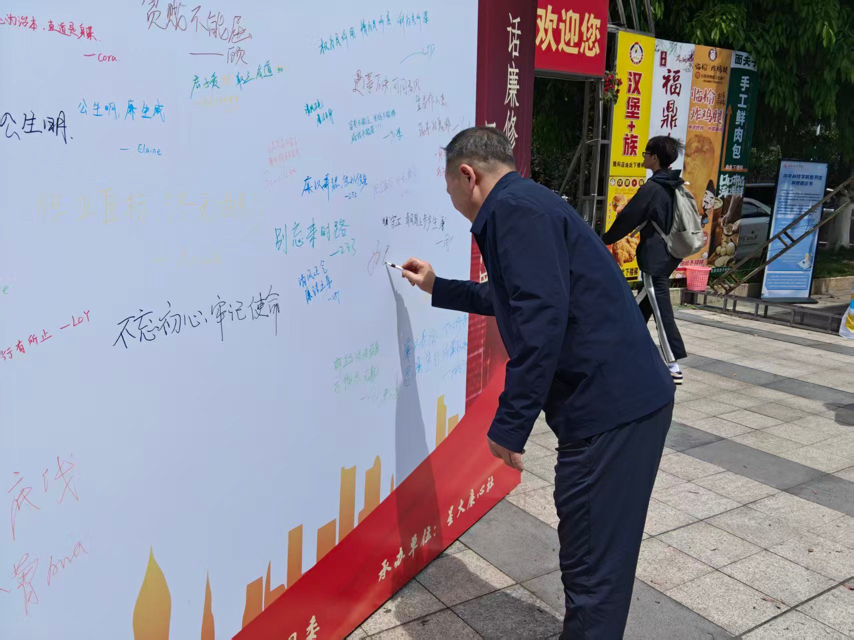 本网讯:4月1日-3日,由校纪委综合办公室、校团委联合指导,星火廉心社承办的大学生“青廉说”签名活动在食堂门口举办。活动以“清风守正道·思廉润初心·笔墨传清廉”为主题,以书写廉洁标语的形式开展,广大学子踊跃参与,以笔墨为媒,共绘廉洁底色。校党委委员、纪委书记、监察专员陈文新及纪委综合办公室相关老师莅临指导并签名。