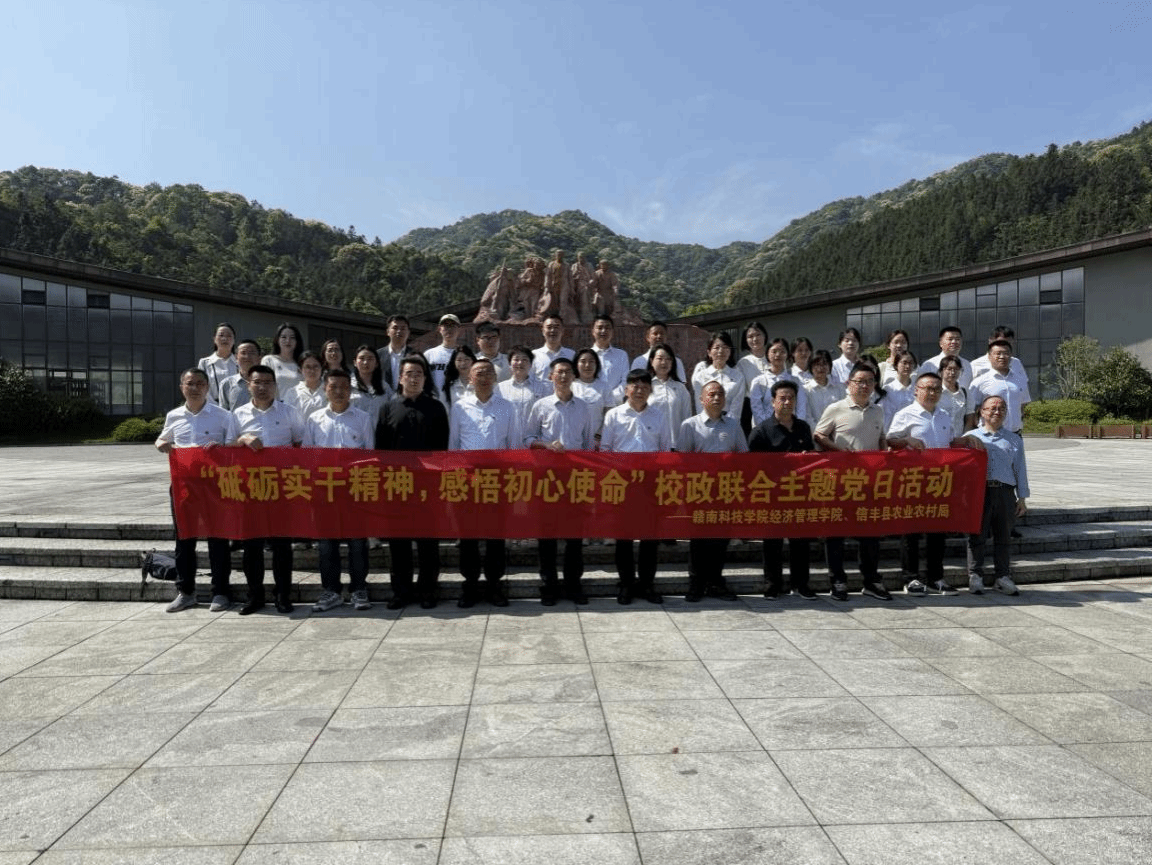 本网讯:4月19日,经济管理学院全体教师党员以及学生党员代表前往赣州市信丰县,与信丰县农业农村局联合开展“砥砺实干精神 感悟初心使命”主题党日活动。经济管理学院党委书记肖永鸿,党委副书记钟秋瓒,信丰县委副书记肖立,信丰县农业农村局党组书记、局长罗明贤参与活动。活动围绕经济管理学院“精益求‘经’ 点石成金”党建品牌创建目标,通过红色旧址现场教学、政治理论学习、现代农业企业调研等形式,引导党员在追寻红色足迹中坚定理想信念,在产业发展一线践行服务使命。