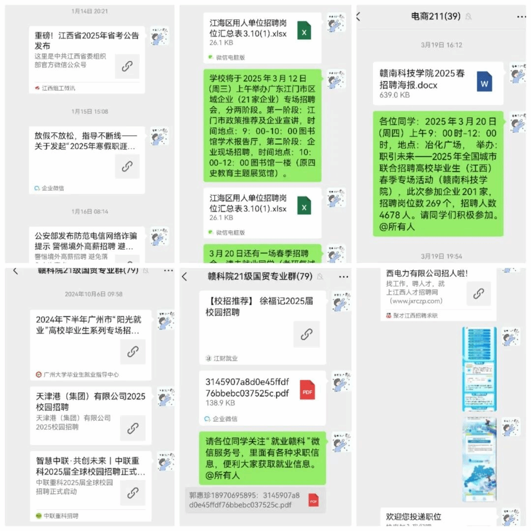 借助微信群、QQ群、学校就业平台等线上渠道,郭惠珍老师每日为学生推送优质岗位信息,累计发布招聘信息500余条,组织学生参加线上双选会30余场。同时,他积极组织学生参与“秋季就业洽谈会”“春季就业洽谈会”及各类专场宣讲会等线下就业活动,有效提升了学生求职实效。